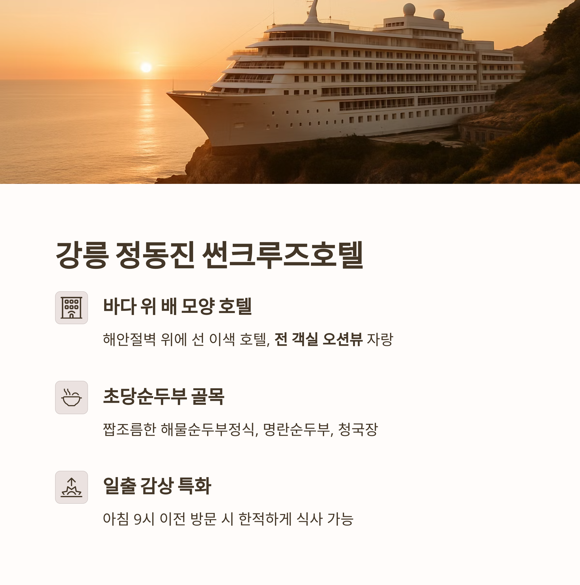 • 숙소 포인트: 일출 감상 특화, 전망대 무료 입장