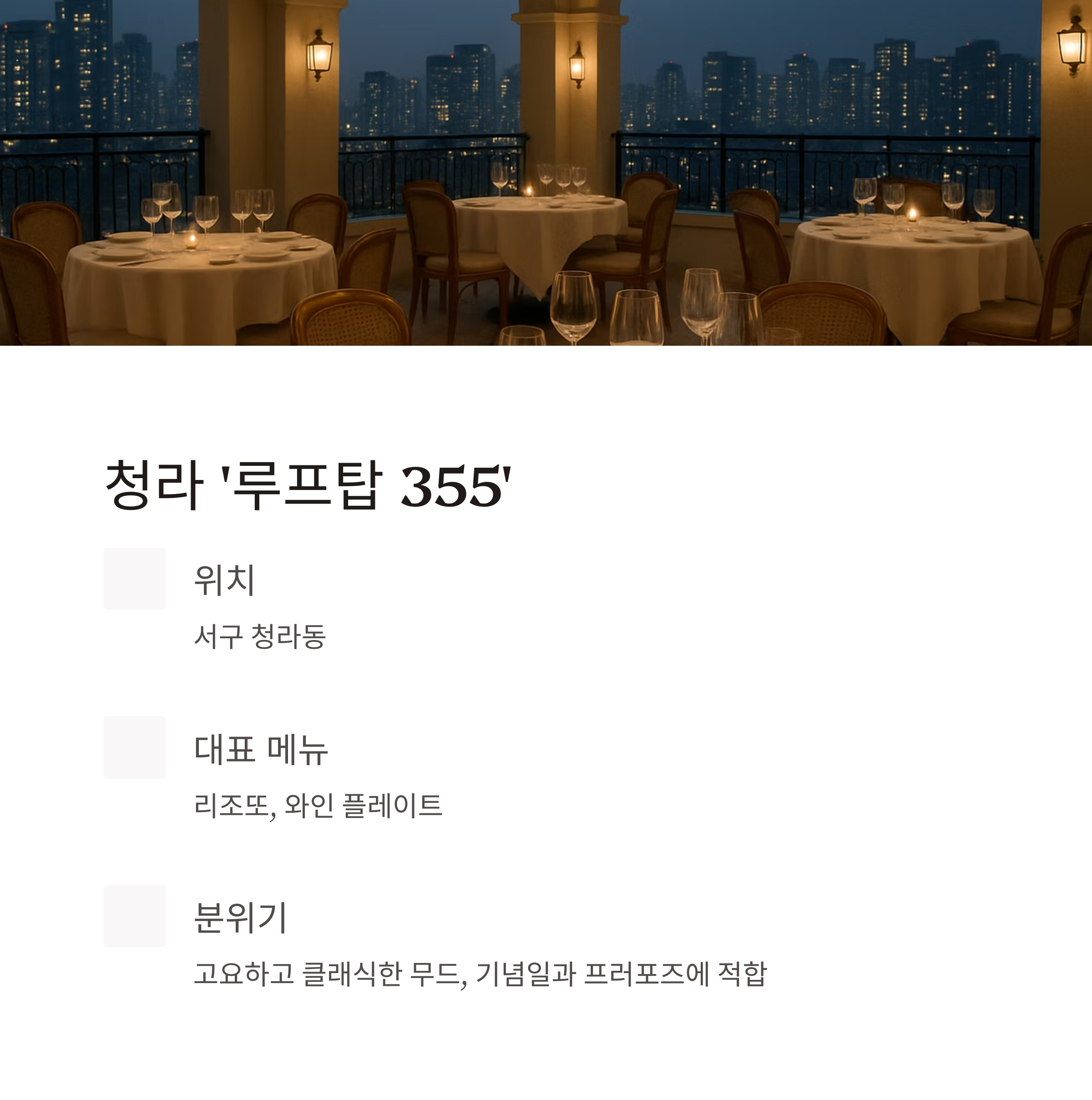 5. 청라 ‘루프탑 355’ – 신도시 속 조용한 감성 레스토랑