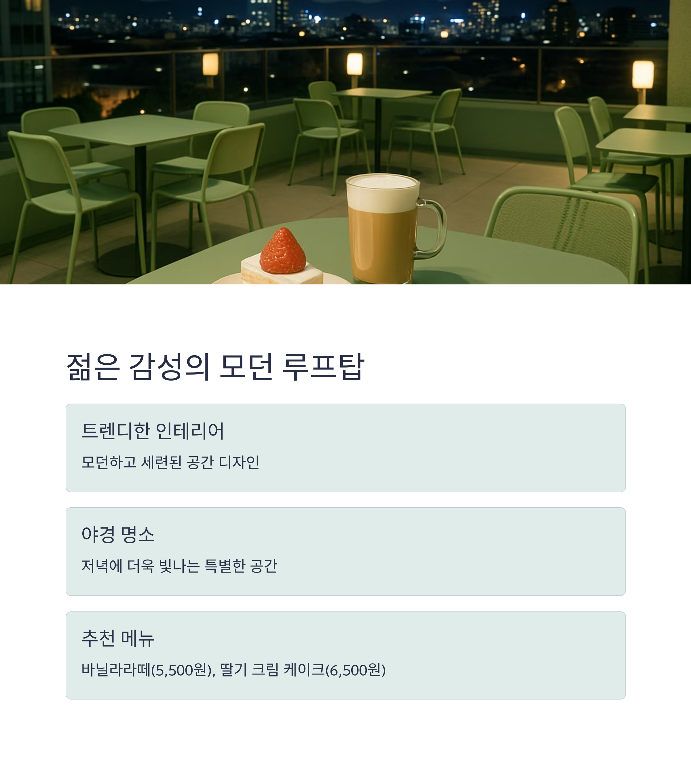 | 오후 7시 | 루프탑 바이브 | 야경 + 케이크 |