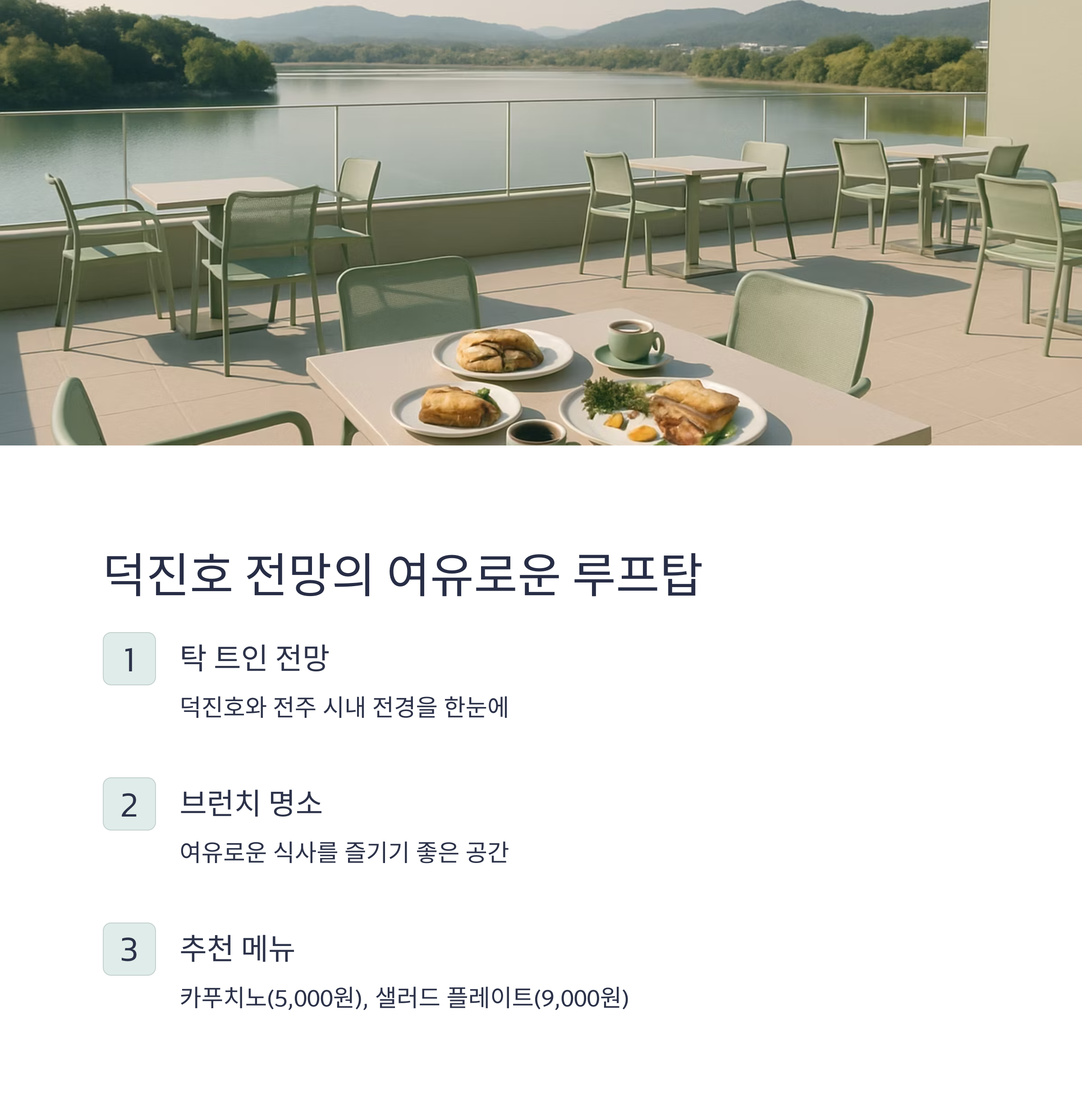 | 오후 5시 | 카페 스카이라운지 | 덕진호 뷰 + 브런치 |