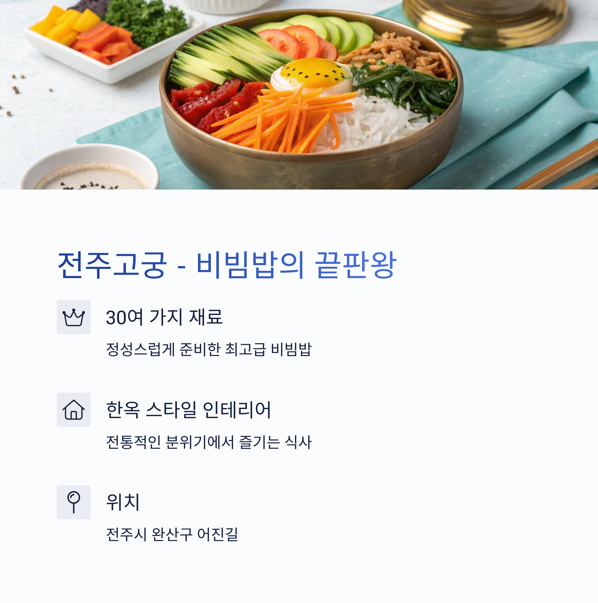| 대표 메뉴 | 전주비빔밥, 육회비빔밥 |