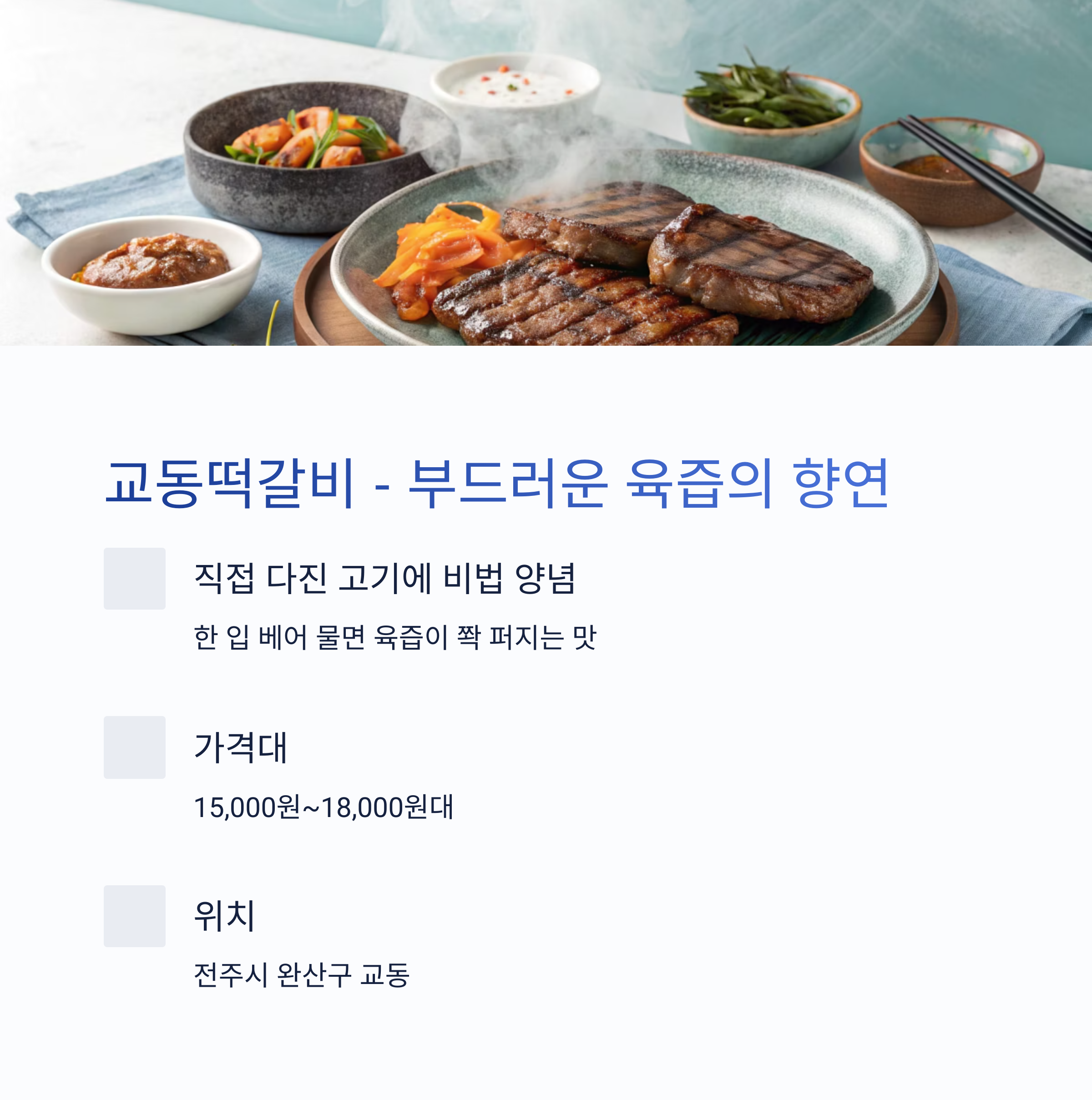 "전주 한옥마을 떡갈비 맛집을 찾는다면 교동떡갈비를 먼저 추천드립니다."
