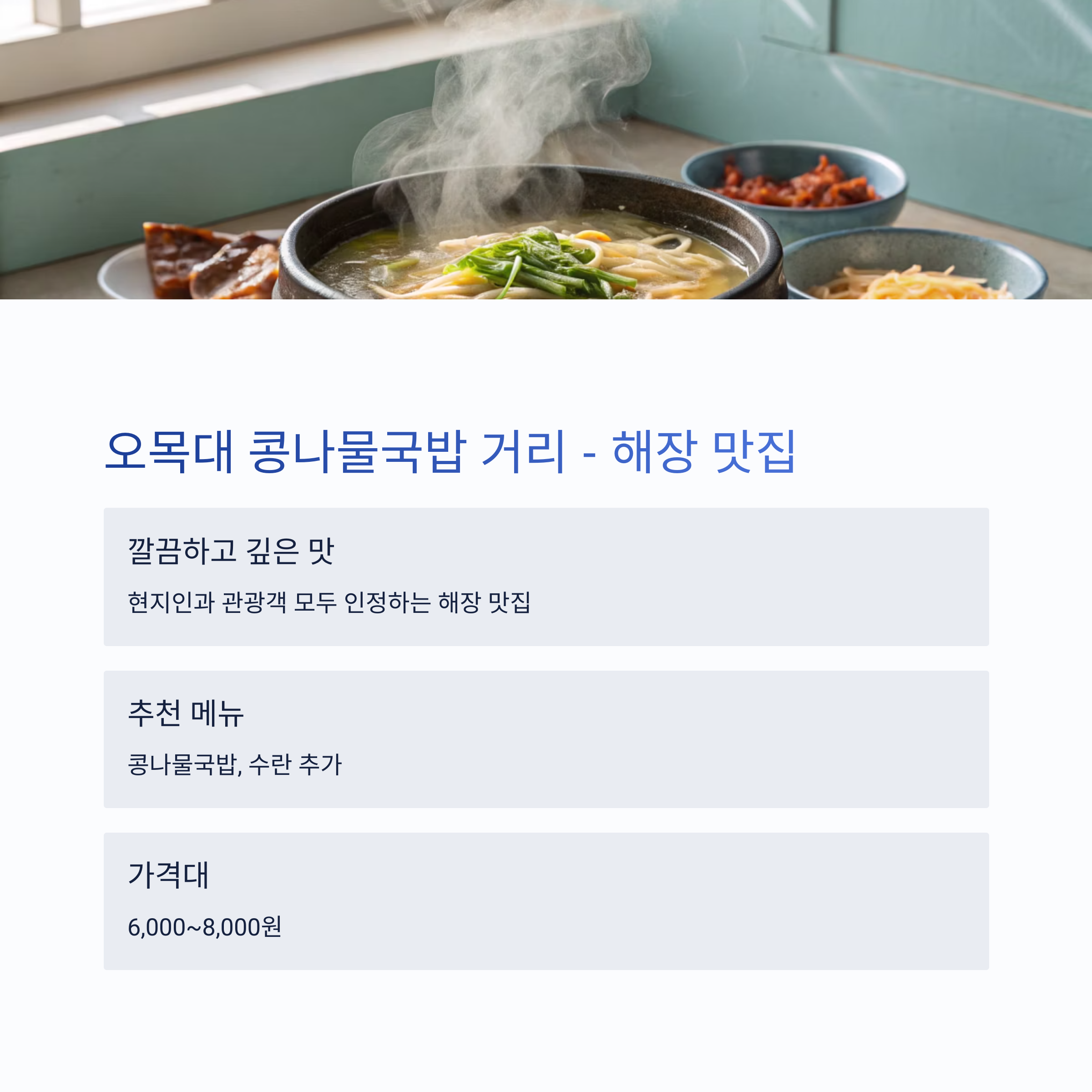 - 대표 메뉴: 콩나물국밥, 수란 추가