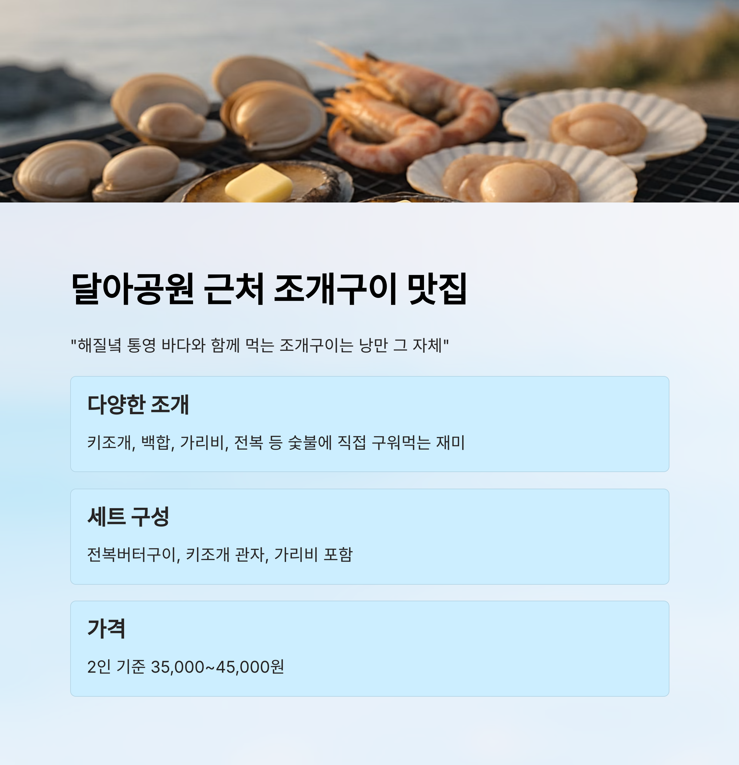 | 조개구이 세트 | 2인 기준 35,000~45,000원 |