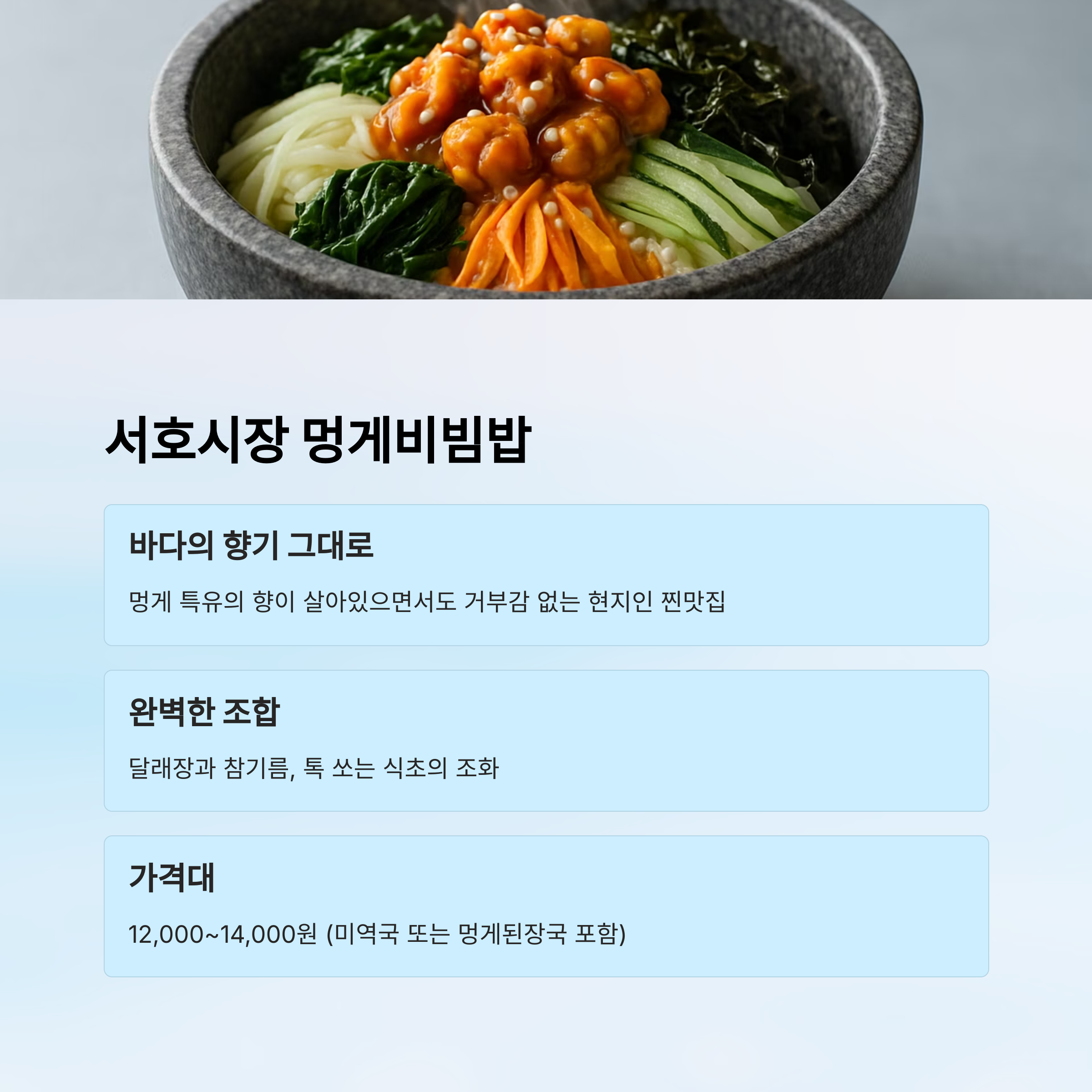 서호시장 멍게비빔밥은 현지인들도 자주 찾는 찐맛집입니다.
